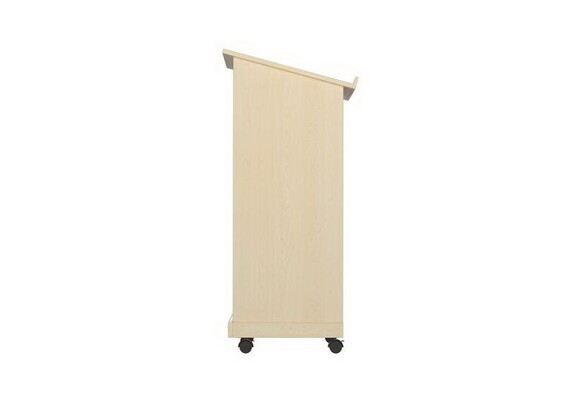 Finally a lectern to match the rest of the furniture in your skilled spaces.This lectern is constructed of maple veneers with three fixed shelves for storing supplies. Rolls easily on four 2"H casters. Overall size: 49-1/2"H (student side) 43-1/2"H (instructor side). The large work surface (25"W x 22"D) includes a pencil edge and is at a 15 degree angle.