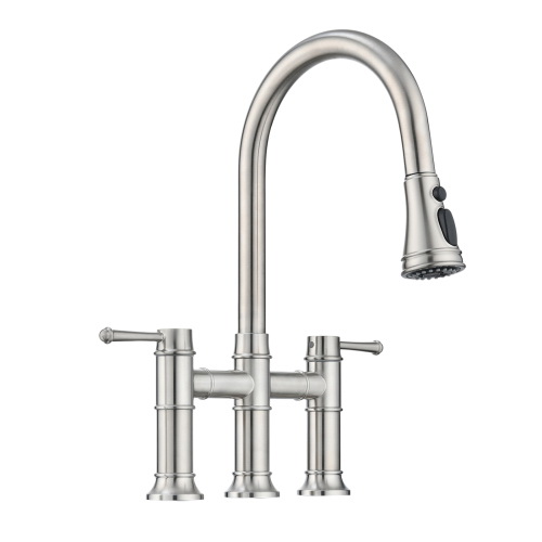 This faucet combines the pull-down faucet with the bridge faucet. Its elegant curves and decorative details perfectly balance the classical and modern styles, creating a transitional look that complements any kitchen and adds a fashionable and novel look to your home.