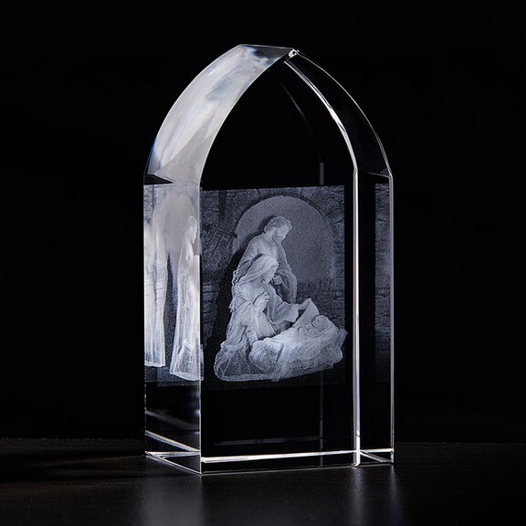 This Etched Glass Stand from Jeweled Cross features a 3D image of The Holy Family in the center. The crystal clear look makes it a good home décor piece.