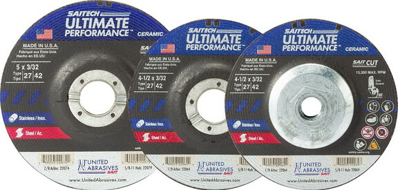 UAS SAIT 22064 Saitech Ultimate Performance P15754405UAS-22069 https://cdnimages.opentip.com/full/UAS/UAS-22064-P.jpg SAIT 22064 Saitech Ultimate Performance High performance, ceramic aluminum oxide grainVery uniform, high density grain structure is extremely durable and self sharpening for long life and cooler cutCombines fast stock removal with long life for tough cutting applicationsIdeal for foundry applications (gates, risers)Application CuttingStainless Stainless steel, high tensile alloysMetal Ferrous metals (iron, steel, welds, etc.)TECH INFO Aggressive cutting performance over a wide range of applications Our unique Super-Lock™ Hub combines both a mechanical locking system and chemical bond providing one e of the safest, vibration-free designs in the industry Super-Lock™ Hub All sizes reinforced with the highest quality fiberglass for maximum safety and performance Designed to provide very long life for fewer wheel changes and less downtime 5/8\"-11 Super-Lock™ Hub Dia Thick Arbor Max RPM Qty PART #   4-1/2\" 3/32\" 5/8\"-11 13300 10 22069 5\" 3/32\" 5/8-11\" 12200 10 22079 7\" 3/32\" 5/8-11\" 8500 10 22089 9\" 3/32\" 5/8-11\" 6600 10 22099 7/8 Arbor - No Hub Dia Thick Arbor Max RPM Qty PART #   4-1/2\" 3/32\" 7/8\" 13300 25 22064 5\" 3/32\" 7/8\" 12200 25 22074 7\" 3/32\" 7/8\" 8500 25 22084 9\" 3/32\" 7/8\" 6600 25 22094 Download the SDS: ENGLISH SPANISH FRENCHAngle GrinderType 27 / Type 425/8-11 Super-Lock™ Hub 15754405 699053220697 4.3900lbs 0.00 0.00 0.00