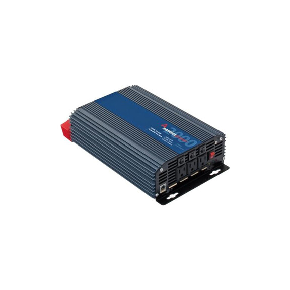 SAMLEX's SAM-2000-12 DC to AC power inverter. 2000 W continuous, 4000 W intermittent. Modified sine wave. Universal outlets (3) for different AC plugs. Remote capable.