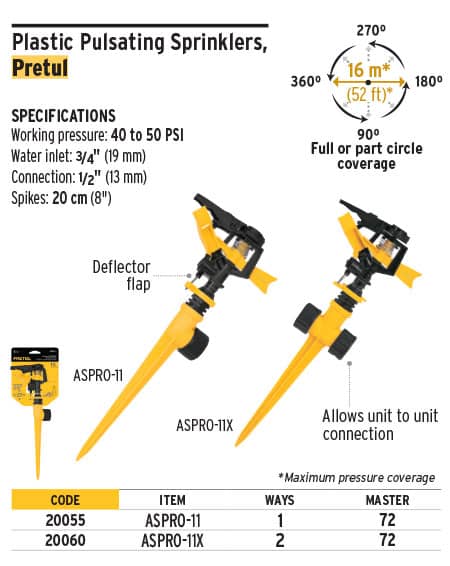 CTR Pretul 20055 Plastic Impulse One Way Sprinkler P15289507CTR-20055 https://cdnimages.opentip.com/full/CTR/CTR-20055.jpg Pretul 20055 Plastic Impulse One Way Sprinkler Manufacturer Part Number: 20055Fabricated bodies made of ABS and stakes made of polypropyleneBoundary clips of irrigation 15289507 7501206652626 0.5500lbs 0.00 0.00 0.00
